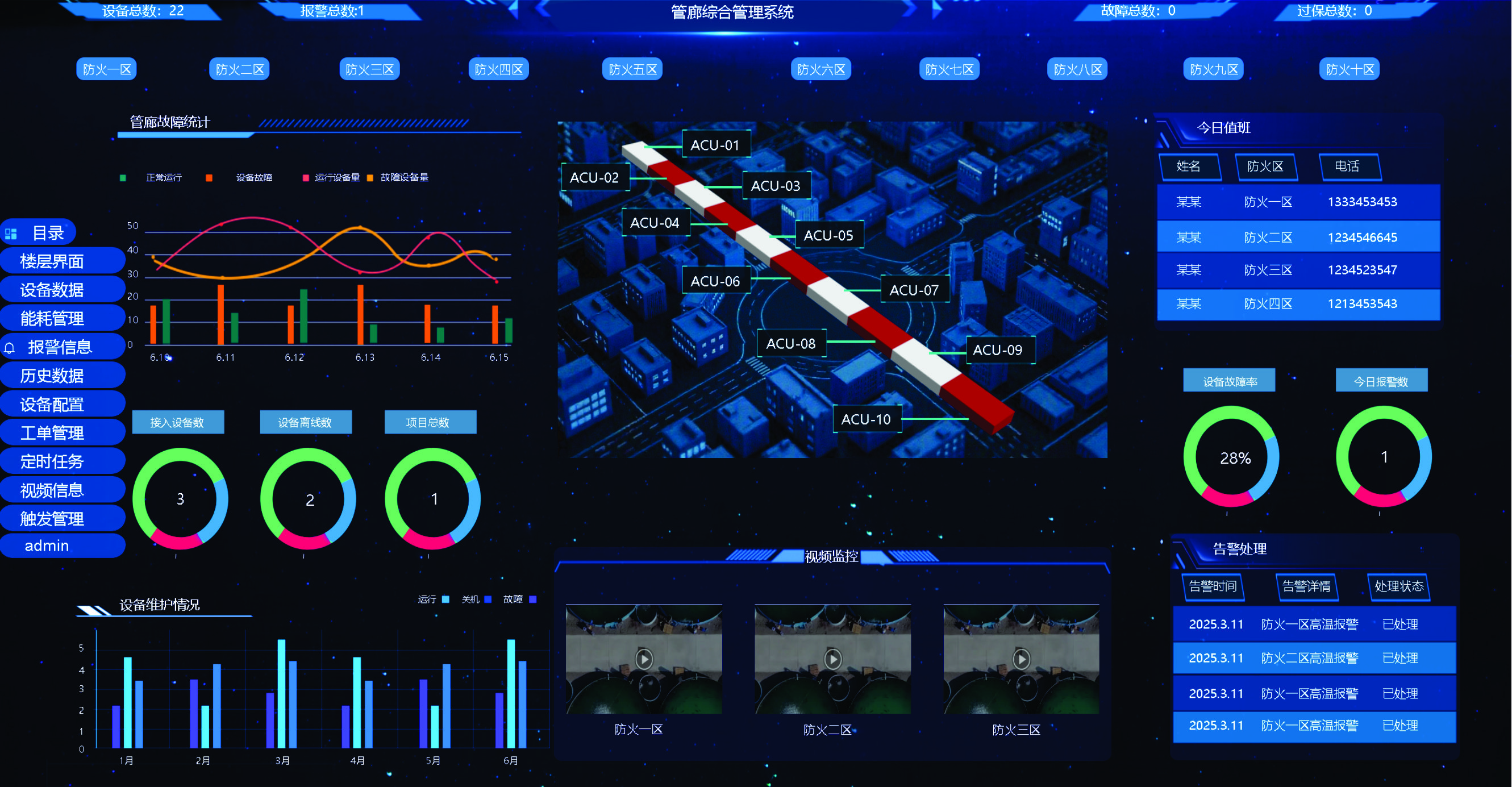 信息匯聚柜與監(jiān)控分區(qū)ACU柜組成監(jiān)控子干環(huán)網(wǎng)和視頻子干環(huán)網(wǎng)控制中心監(jiān)控計算機顯示器上能生動形象地反映出綜合管廊建筑模擬圖、管廊內(nèi)各設(shè)備的狀態(tài)、儀表檢測數(shù)據(jù)和動力配電的實時數(shù)據(jù)并報警。監(jiān)控計算機同時還向現(xiàn)場ACU發(fā)出控制命令、啟?,F(xiàn)場附屬設(shè)備。附屬設(shè)備監(jiān)控系統(tǒng)通過以太網(wǎng)交換機與火災(zāi)報警系統(tǒng)聯(lián)網(wǎng)。